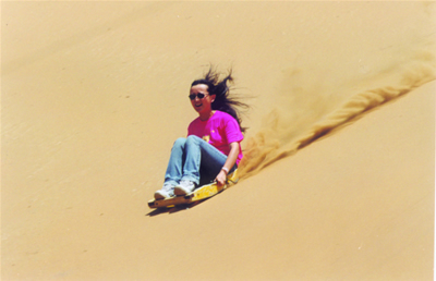 ? ? ? ? ?滑沙,即乘坐滑板從高高的沙山頂自然下滑,滑板用木質(zhì)、竹子、塑料等材料制成,坐在滑沙板上,兩手撐在板壁上,雙腳蹬住前沿,身體微向前傾,下滑時隨著沙山的坡度加大和下滑速度的加快,頓覺兩耳生風,轉(zhuǎn)眼之間就沖到了山下,在有驚無險的瞬間體味到了刺激與快感?;郴榔露纫话銥?5°,游客乘滑沙板以每秒20米的速度下滑,隨著慣性的加大,速度越來越快,驚險刺激又絕對安全?;尺\動類似滑雪和旱地雪橇,需要勇氣和膽量。是草原上非常刺激的深得游客喜愛的娛樂休閑運動。