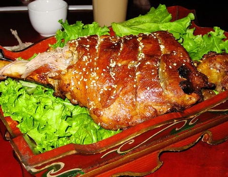 烤全羊是蒙古民族的餐中之尊,是宴席上的一道講究的傳統(tǒng)名菜,其形、色、味,具有濃郁的民族風(fēng)味。上席時烹制者將整羊平臥于一大木盤中,羊脖上系一紅綢帶、打成花結(jié)以示隆重。餐車配有刀、叉,有專人在客人面前將羊卸成小塊,先把里脊上的瘦肉切下來,放在盤子里端上去,視客人身份依次奉遞,然后把帶骨頭的肉端上去,接著才能上飯。這便是烤全羊待客的全過程。