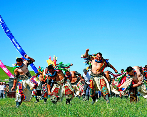 蒙古式摔跤(現(xiàn)統(tǒng)稱“博克”),不受年齡、體重和地區(qū)限制,不計(jì)時(shí)間,采取一次淘汰制。賽前,由一位德高望重的長(zhǎng)者進(jìn)行編排和配對(duì),現(xiàn)在則由大會(huì)組委會(huì)作出安排。參賽博克(摔跤手)必須是偶數(shù),根據(jù)蘇木(鎮(zhèn))、旗(縣)不同層次級(jí)別,參賽博克為32、64、128、256對(duì)不等。參賽博克上身穿鑲有銅釘或銀釘,用牛皮或多層帆布制成的“昭德格”(摔跤服),腰間扎上寬厚的皮帶,系上用紅、蘭、黃三色綢子制成的圍裙,下身著白色肥大的摔跤褲和繡有吉祥圖案的套褲。足蹬蒙古靴。項(xiàng)戴五色綢穗制成的彩帶“景嘎”.景嘎越多.表示參賽博克獲獎(jiǎng)的次數(shù)越多。